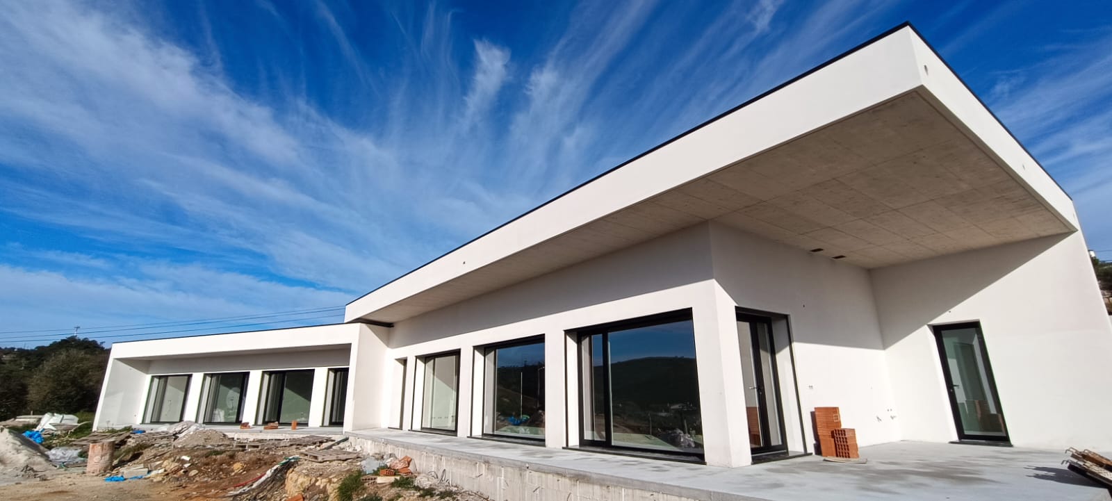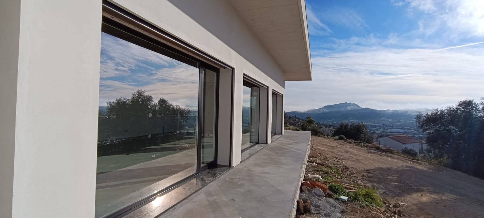 Instalação de caixilharia em alumínio numa moradia unifamiliar em Ourém. Obra destacada por sacadas de abrir oscilo-batentes e vãos fixos em vidro laminado.
